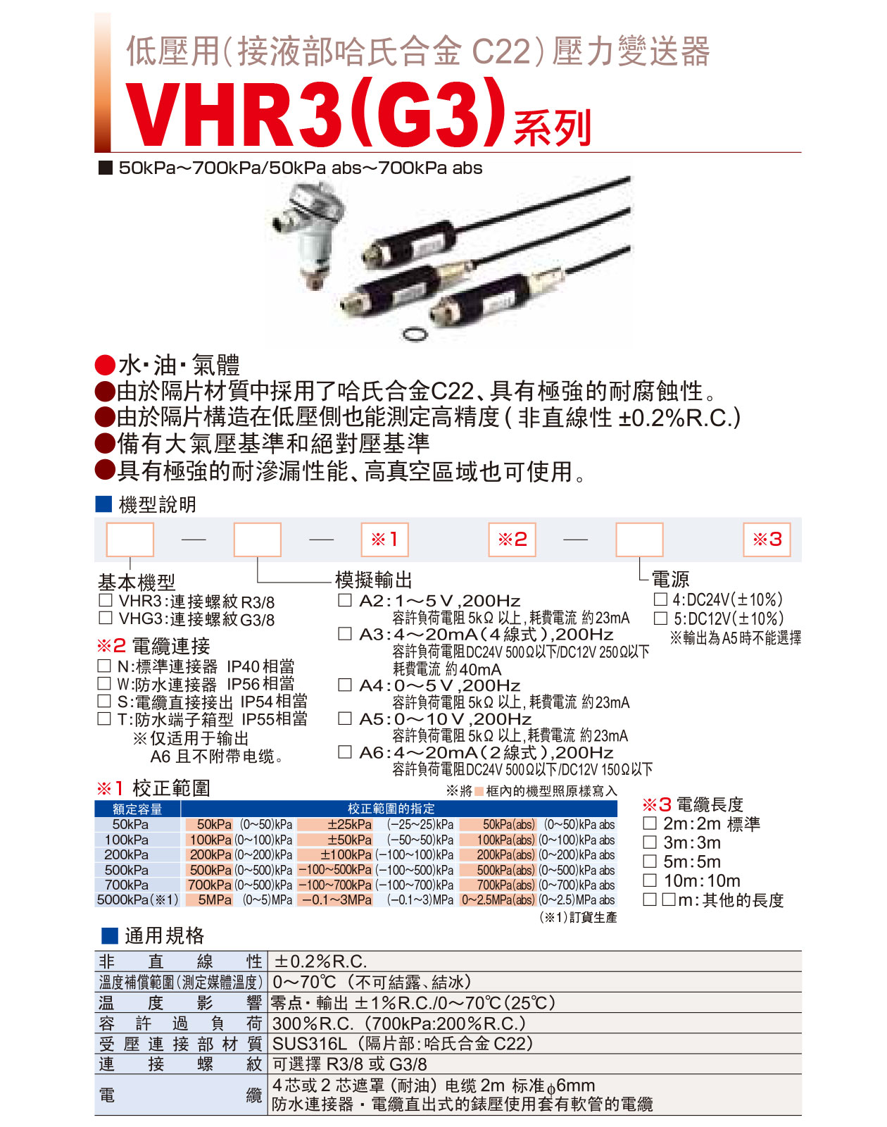 VHR3 ( G3 )系列:50kPa~700kPa/50kPa abs~700kPa abs